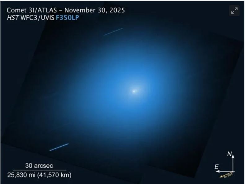 Una de las imágenes más recientes de 3I/ATLAS la tomó el telescopio espacial Hubble, de la NASA, el 30 de noviembre. En ese momento, el cometa se encontraba a unos 286 millones de kilómetros de la Tierra.