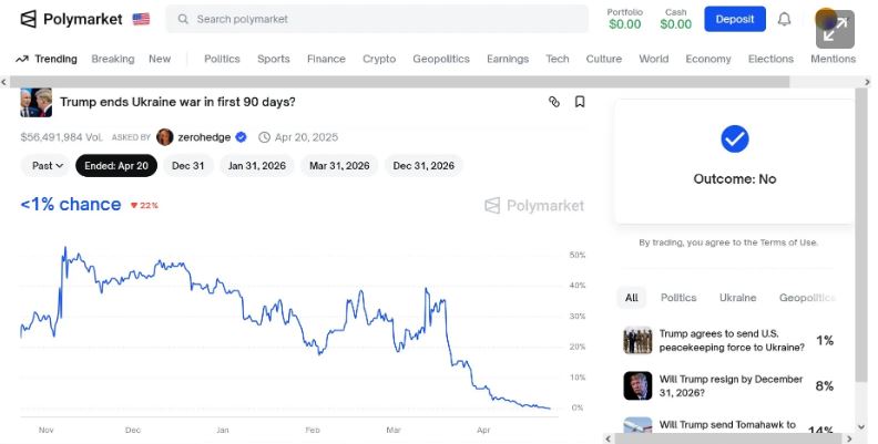 El sitio web de Polymarket registra actualmente 333 apuestas cerradas relacionadas con Ucrania. Una de las de mayor volumen, por más de 56 millones de dólares (48 millones de euros), se centraba en si Donald Trump podría poner fin a la guerra en los primeros 90 días de su presidencia.