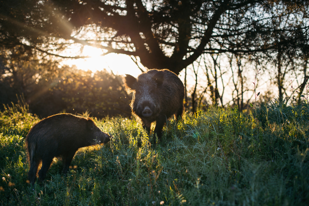 Una familia de jabalíes sobre la hierba verde en el bosque de montaña de Barcelona al atardecer. Foto: Shutterstock.