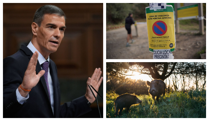 Izquierda: El presidente del Gobierno español, Pedro Sánchez. Foto: EFE/ Borja Sanchez-Trillo. Derecha: Esta imagen del 29 de noviembre de 2025 muestra una señal de advertencia de la policía local que indica «Zona de Vigilancia de Peste Porcina Africana» colocada en la entrada del parque natural de Collserola, cerca de Barcelona,. Foto: Manaure Quintero / AFP vía Getty Images/ Una familia de jabalíes sobre la hierba verde en el bosque de montaña de Barcelona al atardecer. Foto: Shutterstock.